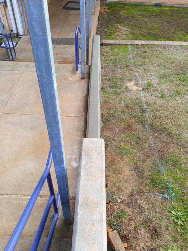Part of the drainage work we performed at Cushing ISD included the installation of a concrete barrier to keep water from running over the stairs. No more wet feet for the students and teachers! We also installed downspout drainage in the playground area to make recess more fun, less soggy.