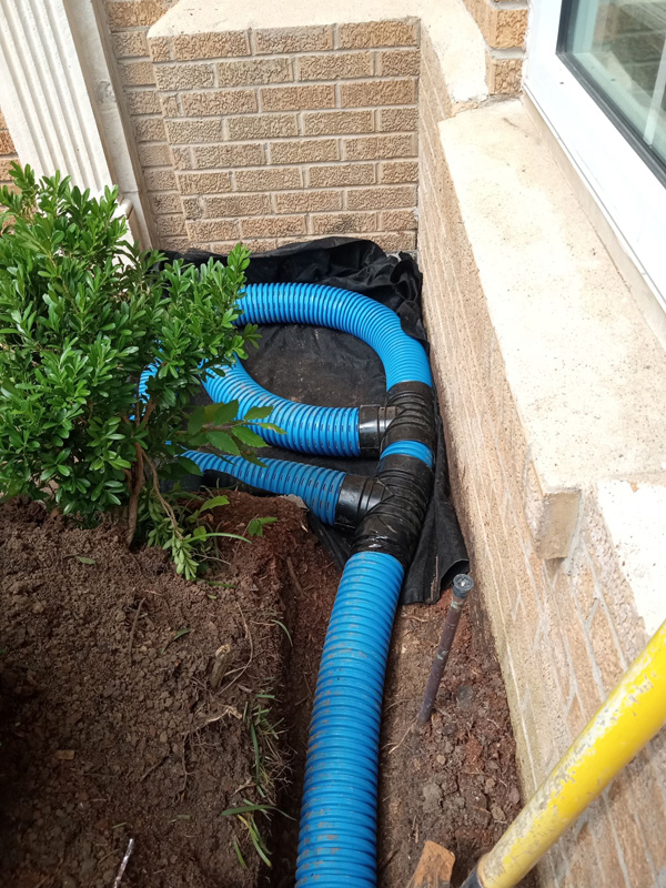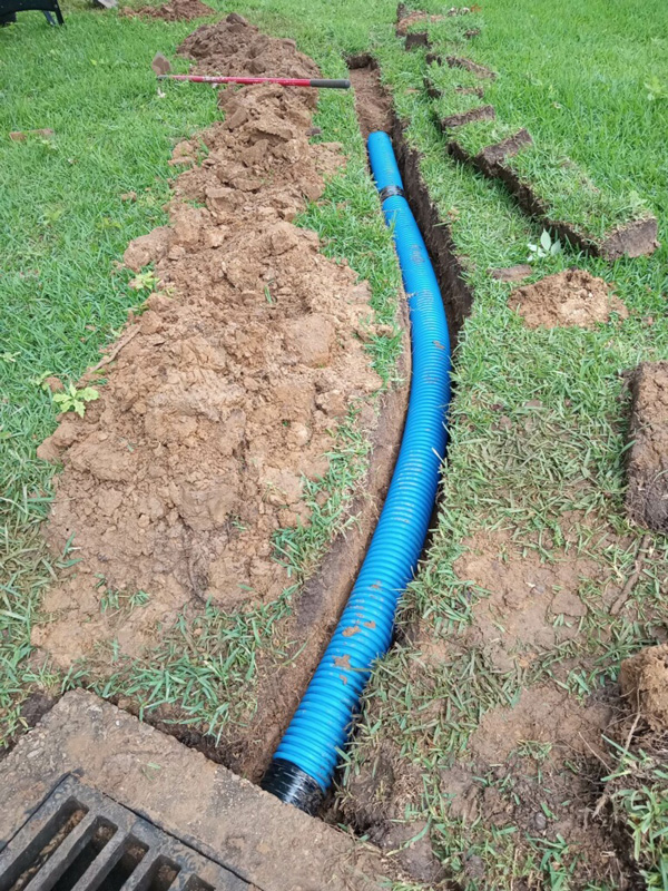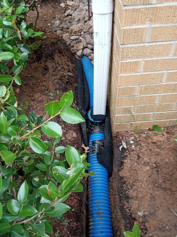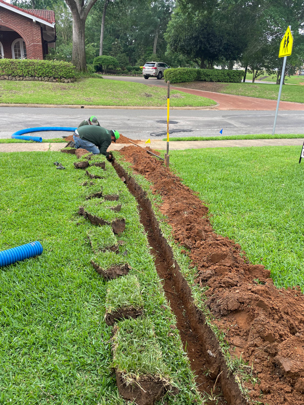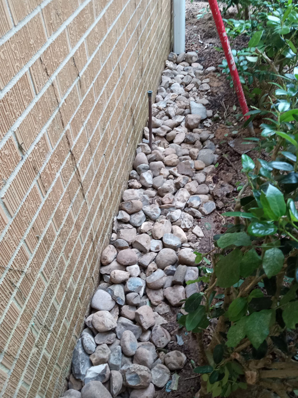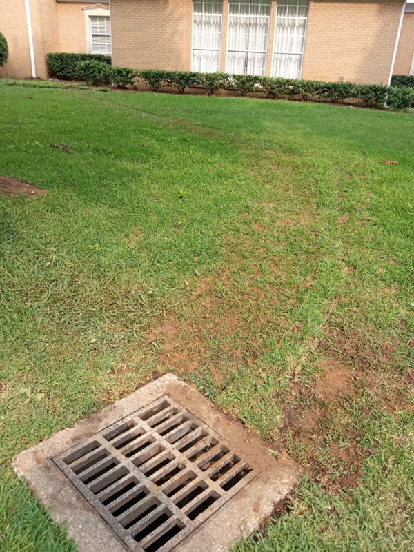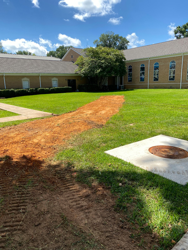 First Christian Church in Nacogdoches had a big problem on their hands thanks to improper drainage. Even the smallest bit of rain would seep through a corner of the building, raising concerns of mildew, mold and termites. Our solution was simple; we put an open French drain, perforated pipe, drain rock and drain fabric in the trouble spot and then connected it to solid pipe that went through the grass, under the sidewalk and ended at our custom curb drain.