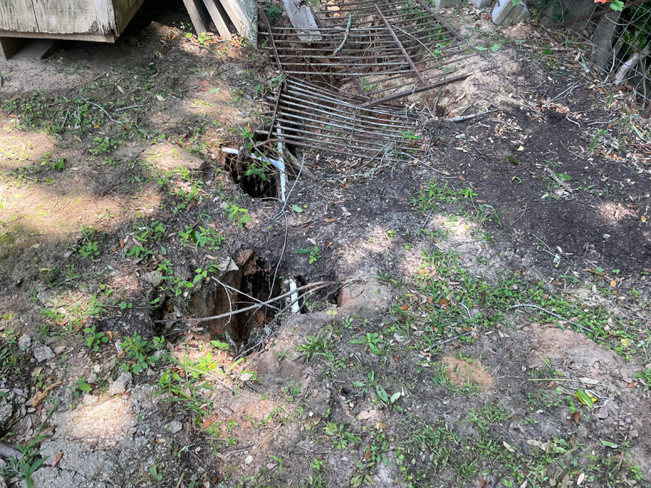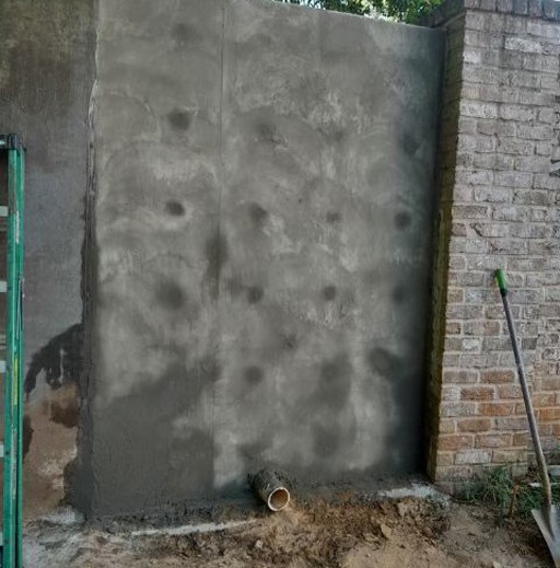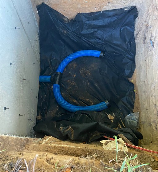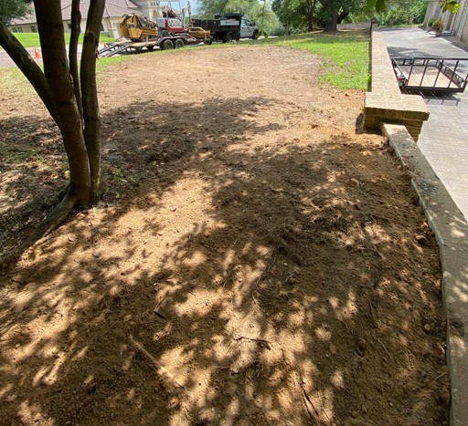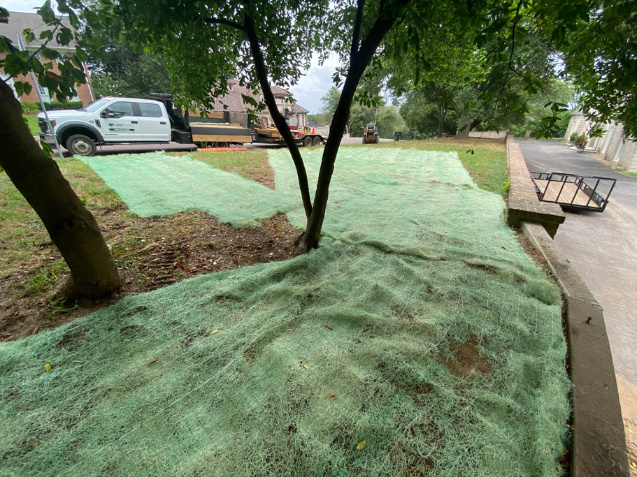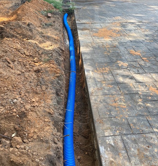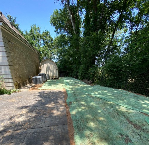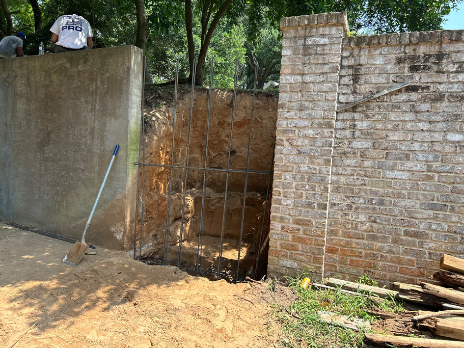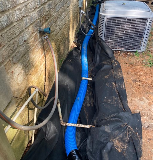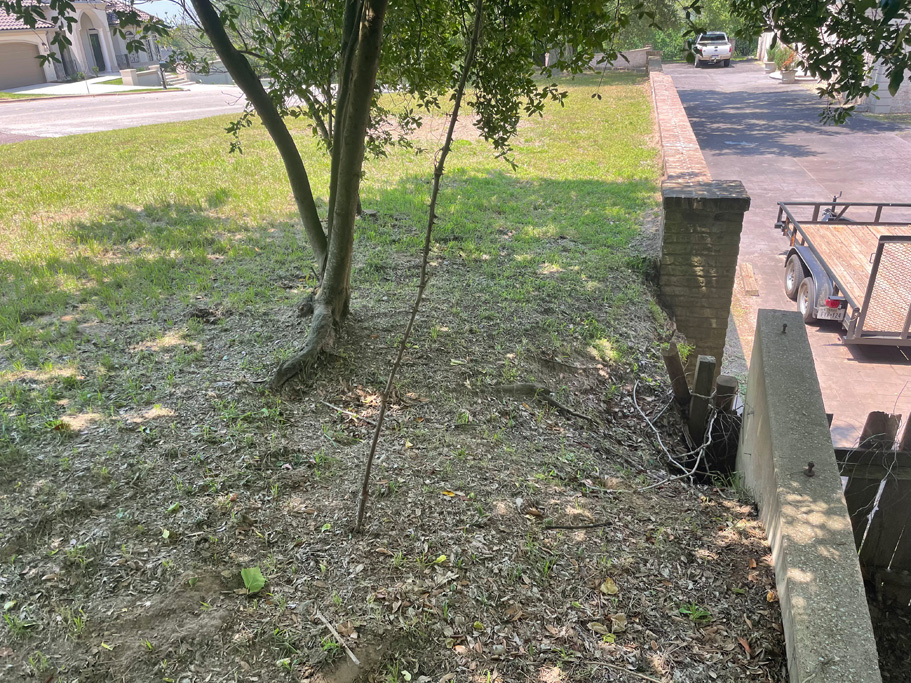 Our team installed an open French drain to collect water and help prevent further erosion at this property. We also filled in the erosion area and graded and seeded the front lawn. While we do most retaining wall construction and repair ourself, we subcontracted out the installation of this particular concrete retaining wall.