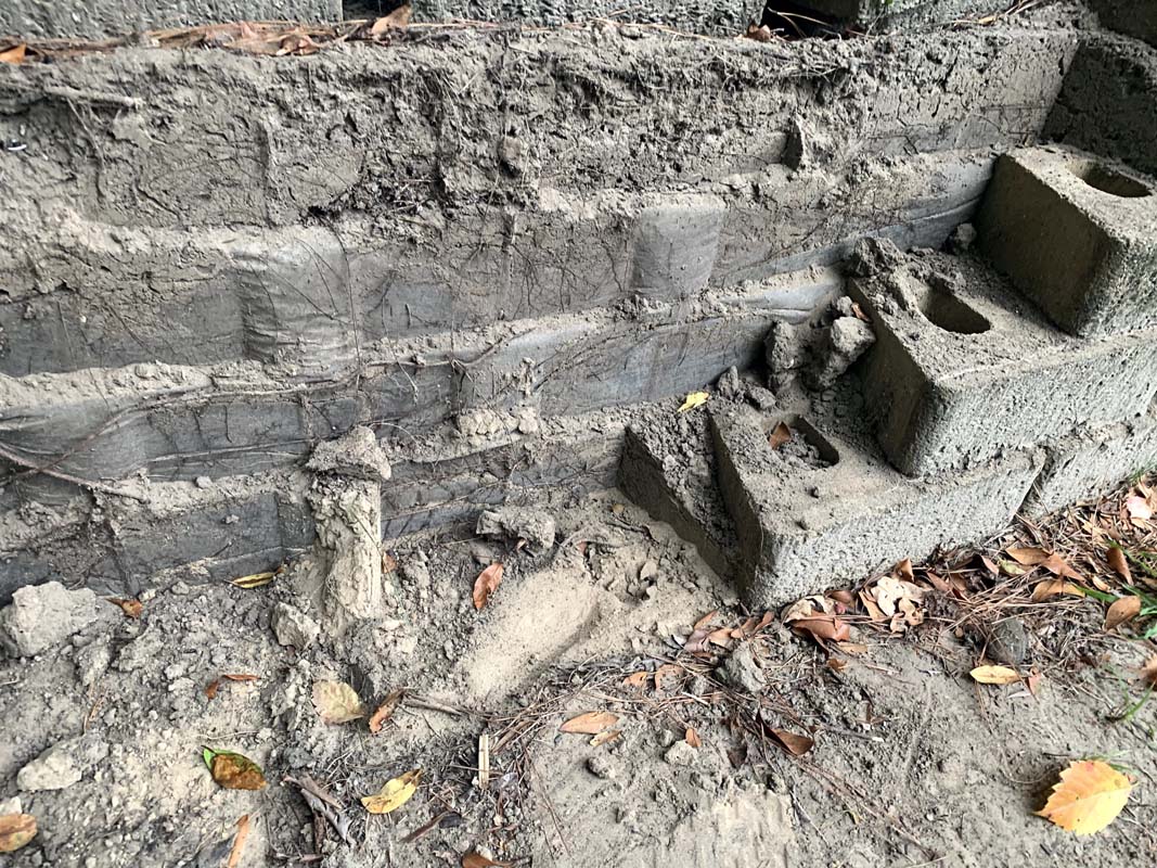 We call this photo series “Anatomy of a Failed Retaining Wall.” You can clearly see the wall jutting out in the first photo. Upon investigation, we found two critical errors: no compacted base under the wall and no drain system behind the wall. Our rebuild will help it last for years to come!