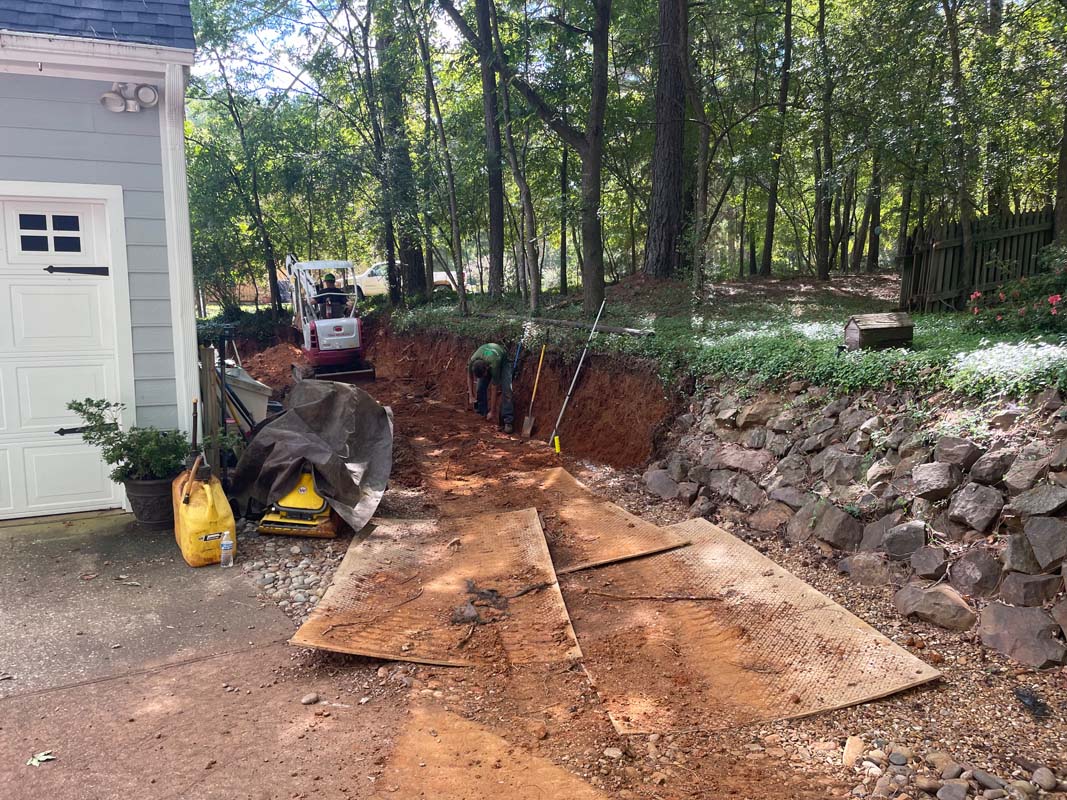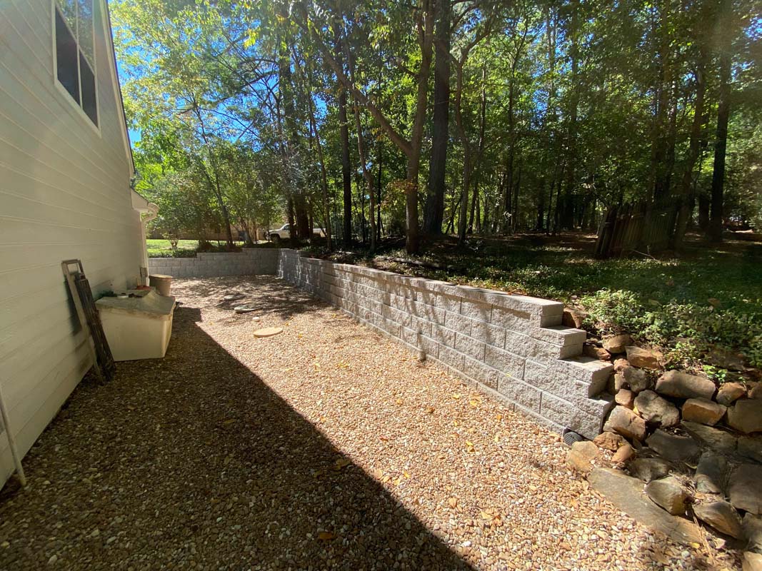 For this retaining wall project, we used Keystone compac 3 split face block in flint. That block worked out great, but the project itself was not without its difficulties. We had to work around the septic system, and the clay soil was very hard to dig. When it was all digged and done, though, our crew did a great job of cleaning up. You can already see how much brighter and bigger the area is with the new retaining wall, and we're proud to say this wall will be there for years to come!
