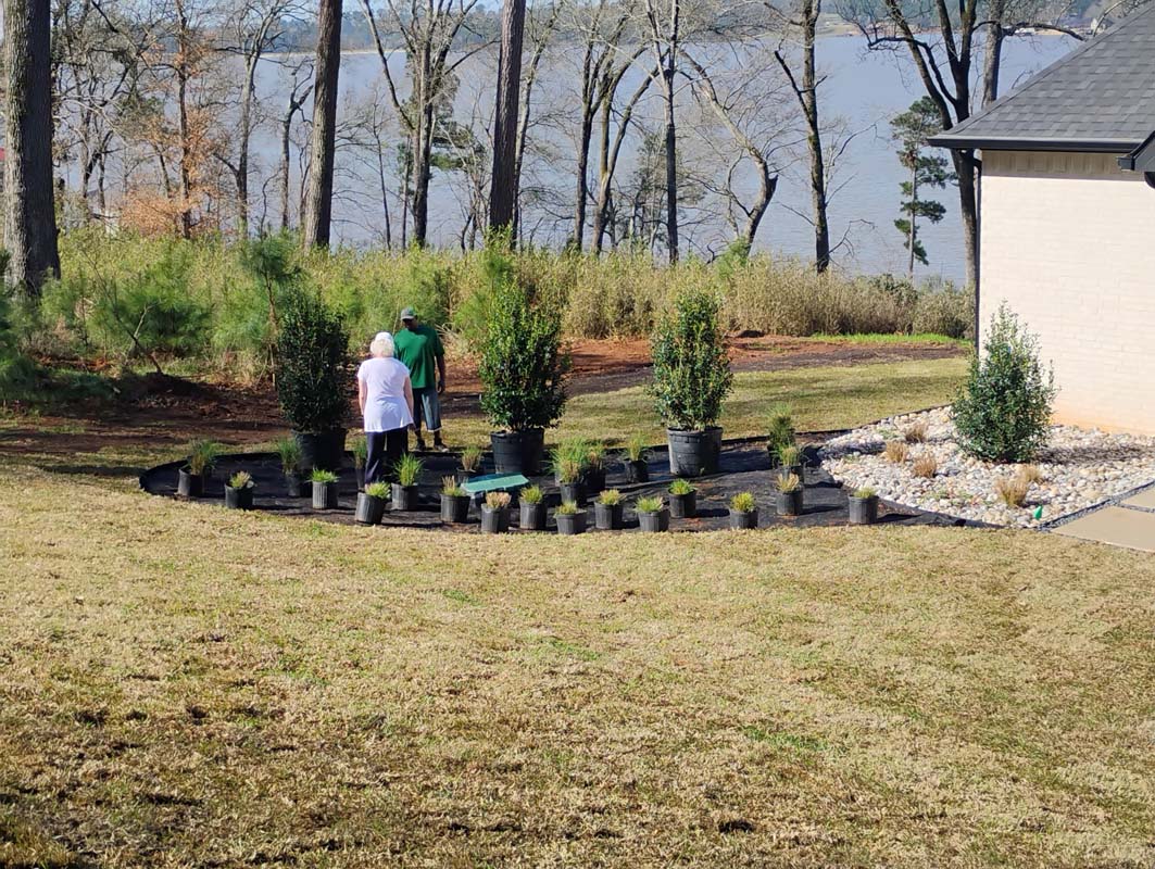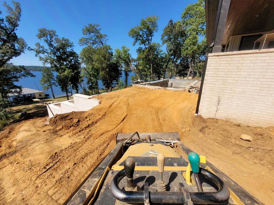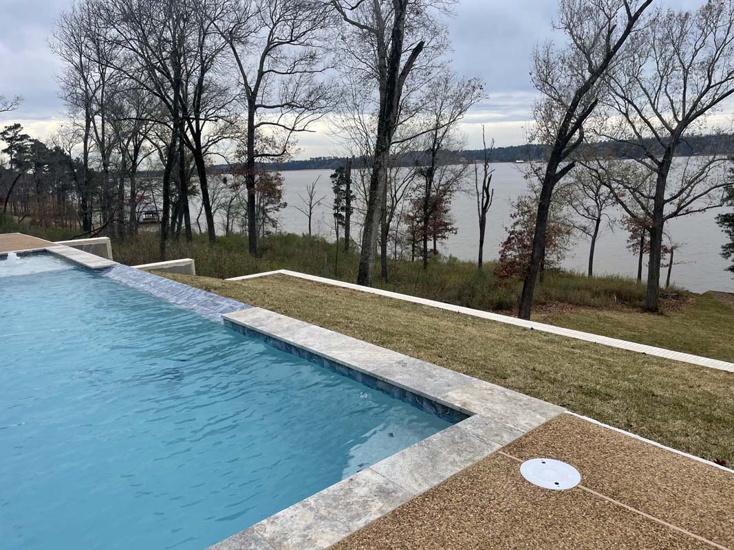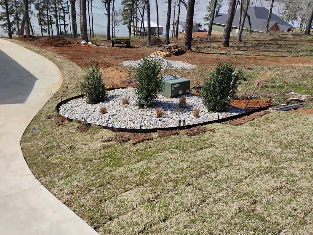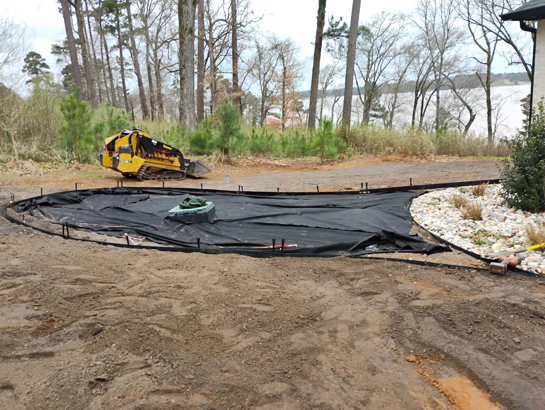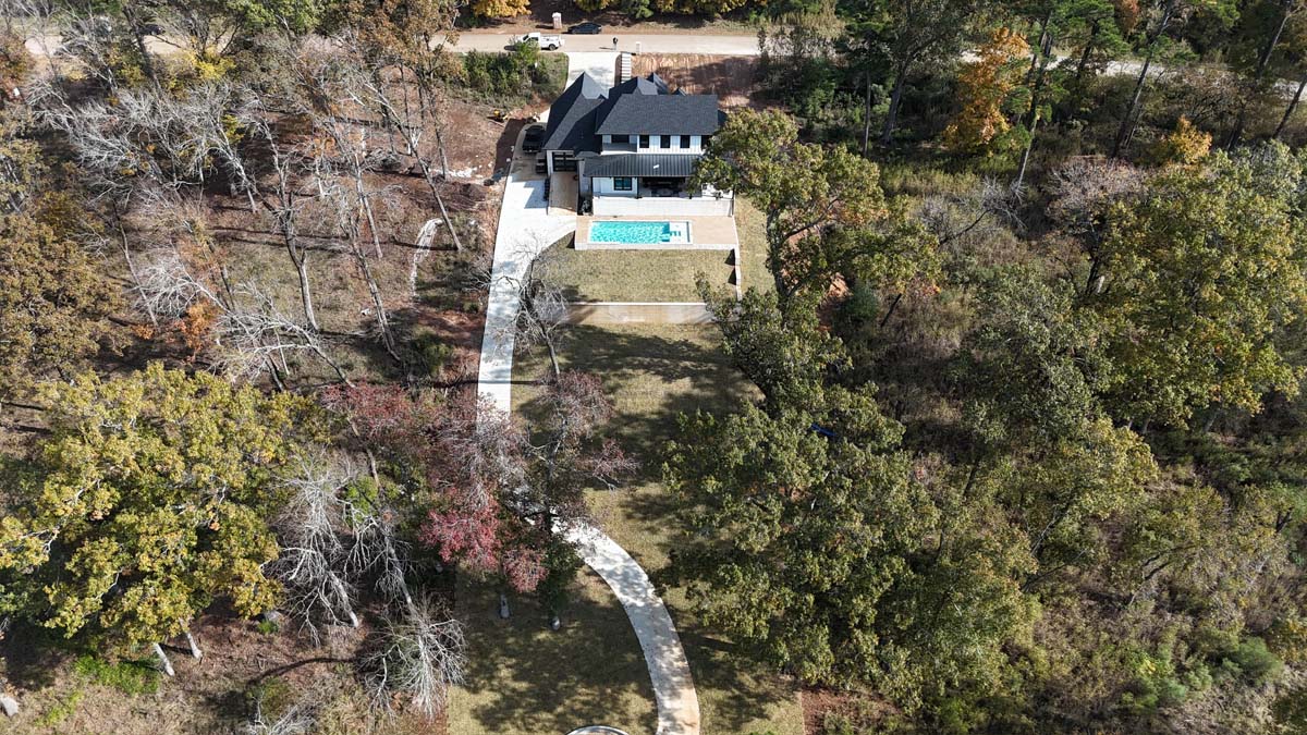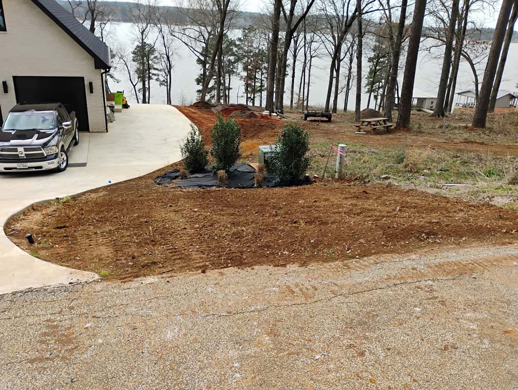 A new home build out on Lake Nacogdoches required a new landscape to go with it, and our team delivered! The project included front and back landscape design, erosion control measures, custom drainage system, a retaining wall below the pool to accommodate the home’s septic system, irrigation needs, a front floating sidewalk design, front custom concrete stepper sitting area, sod installation and a golf cart path layout down to the lake. A massive project like this just goes to show that the property is just as important as the home!