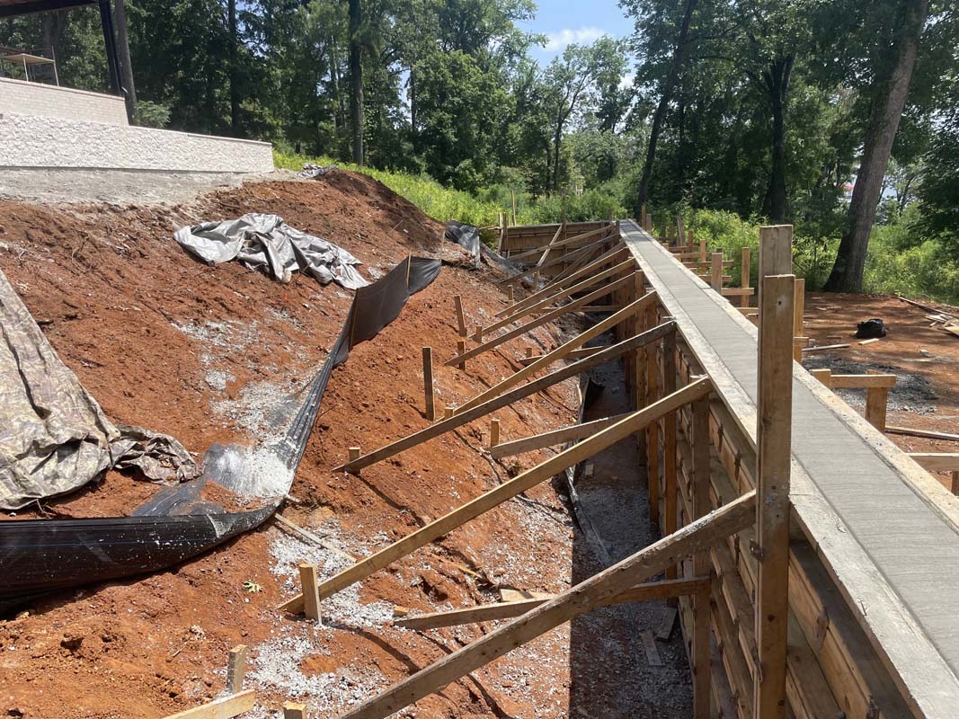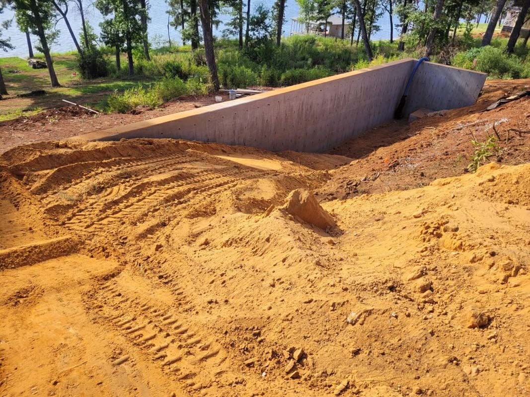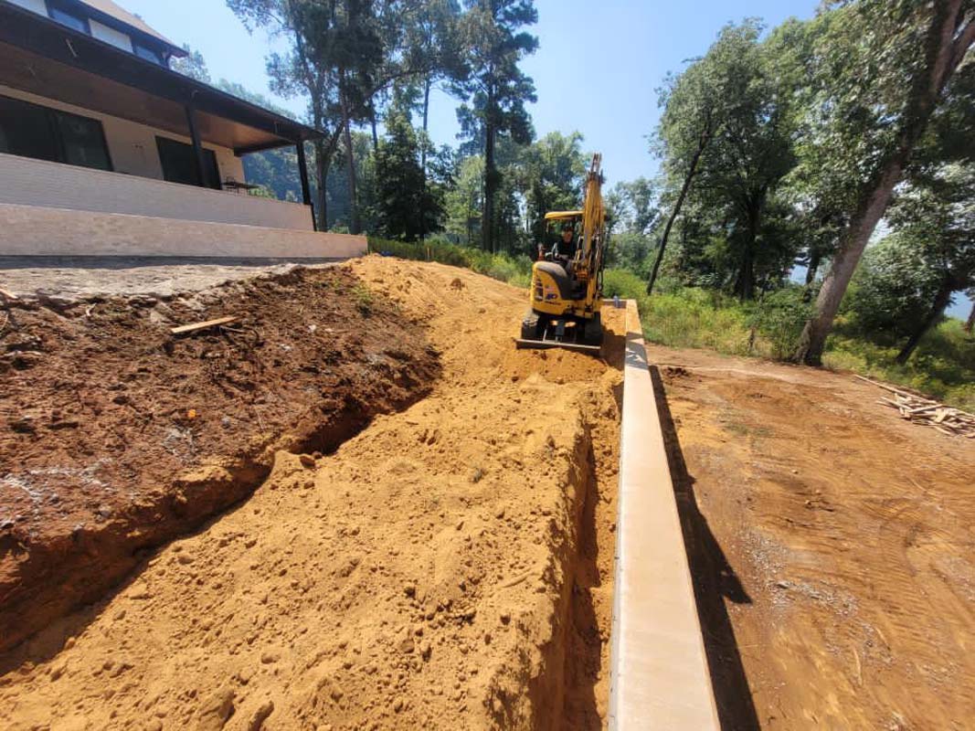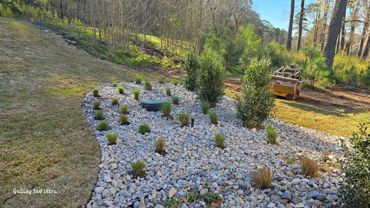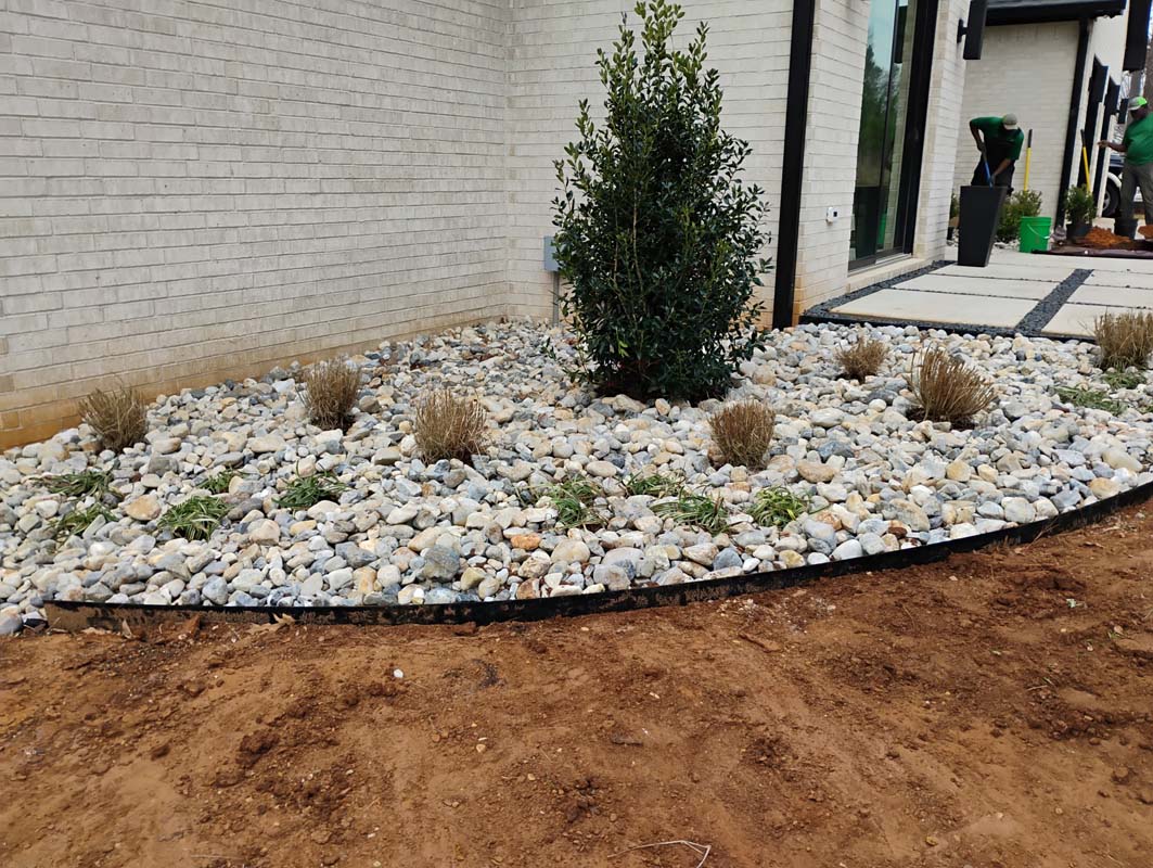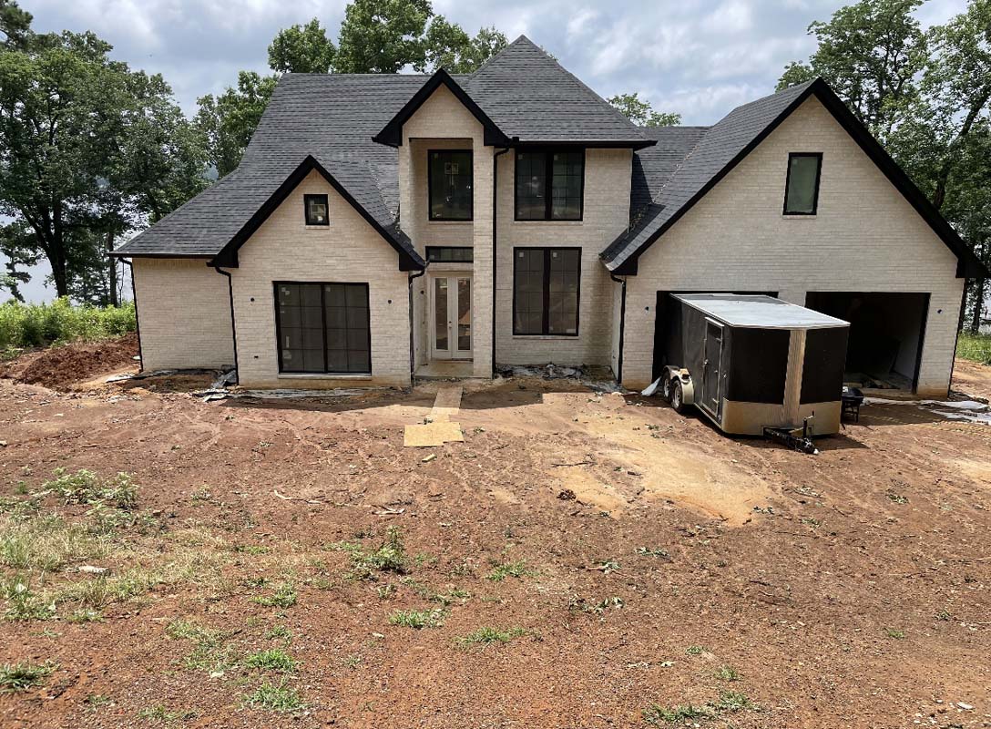 A new home build out on Lake Nacogdoches required a new landscape to go with it, and our team delivered! The project included front and back landscape design, erosion control measures, custom drainage system, a retaining wall below the pool to accommodate the home’s septic system, irrigation needs, a front floating sidewalk design, front custom concrete stepper sitting area, sod installation and a golf cart path layout down to the lake. A massive project like this just goes to show that the property is just as important as the home!