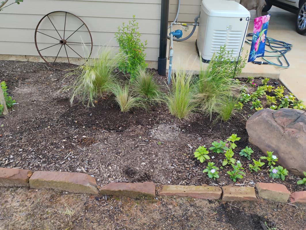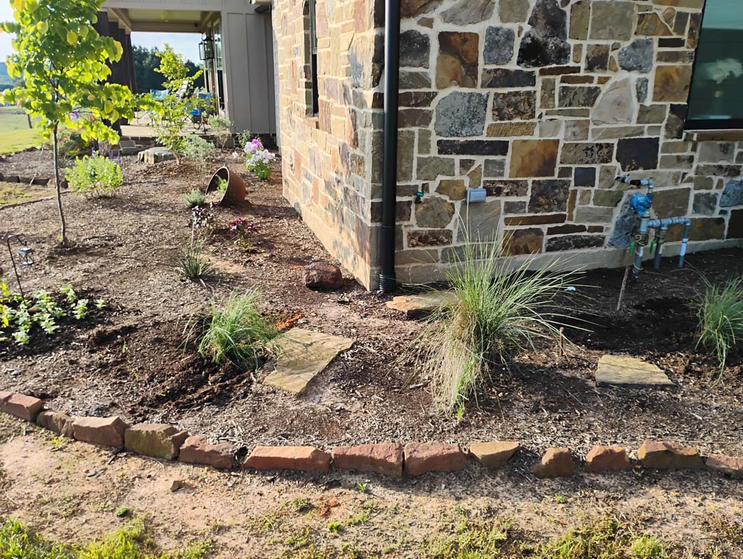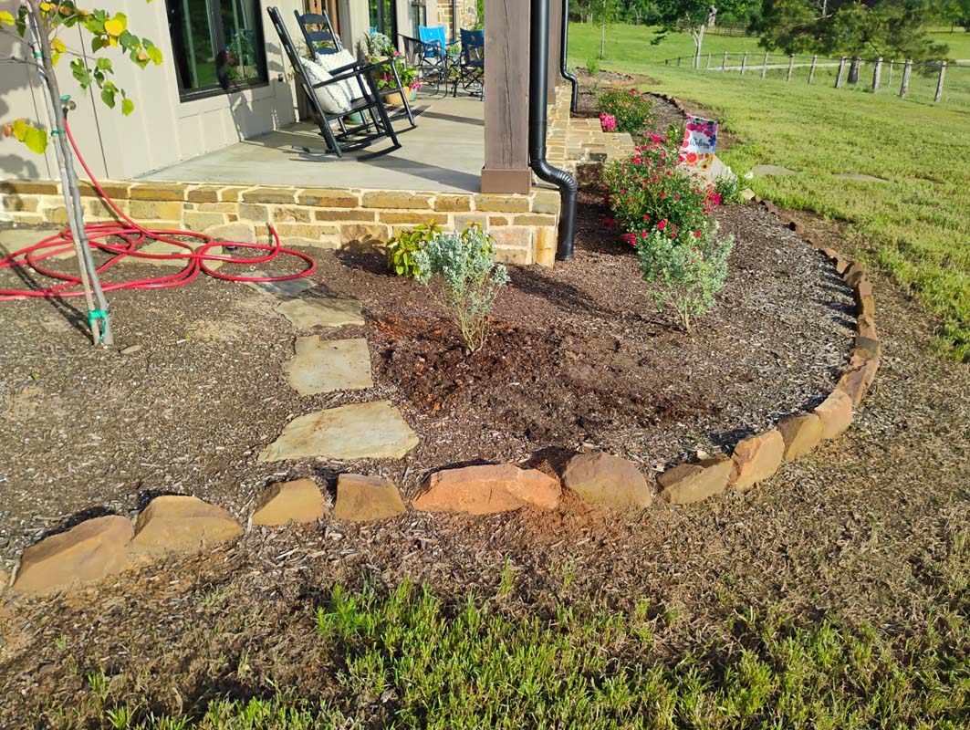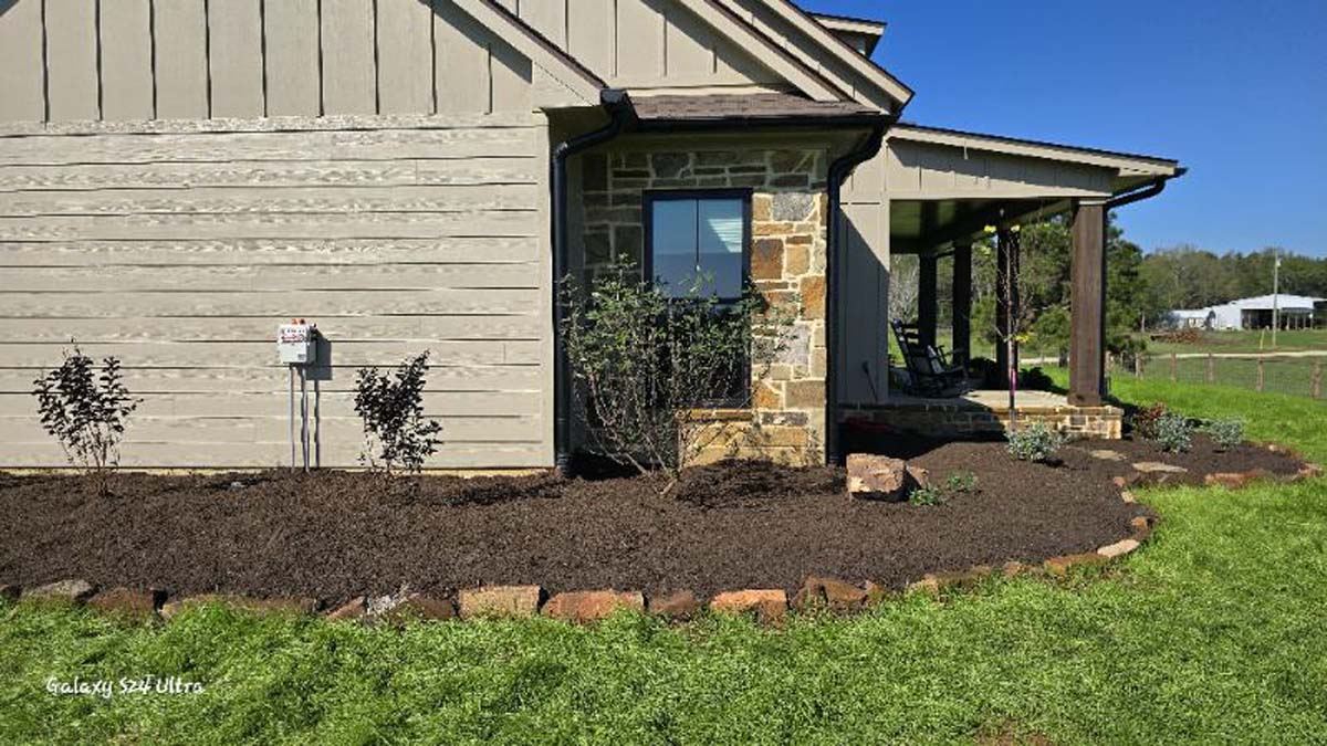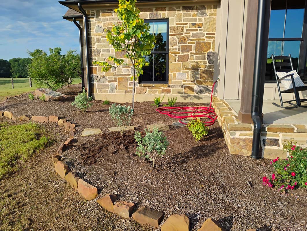 After installing an irrigation system and designing and building flower beds, our team hydromulched the lawn for this new construction project. We want your yard to be just as beautiful and functional as your home! Let us dress up your new home with a new yard! Call (936) 615-6568 for a free consultation.